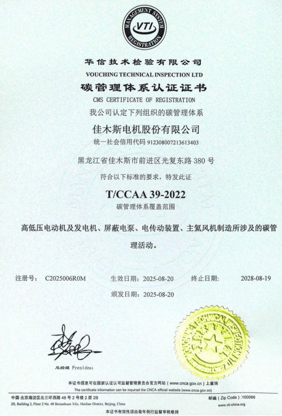 8月20日,哈電集團佳木斯電機股份有限公司(以下簡稱“佳電股份”)順利通過華信技術檢驗有限公司認證機構審核,榮獲碳管理體系認證證書,成為防爆電機行業(yè)首家獲得該認證的企業(yè)。此次審核的通過,標志著佳電股份在碳排放管理、綠色低碳發(fā)展方面邁入新階段。